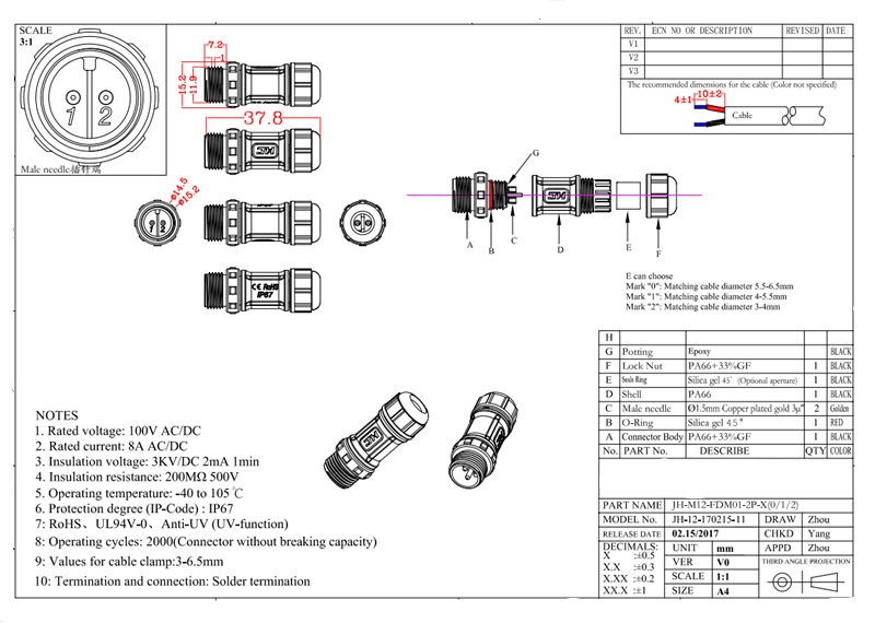 Place of Origin:Guangdong, China Model Number:M12 Type:ADAPTER Application:Power/Signal/Led lighting Gender:Male/Female Color:Black Pin:2/3/4/5/6pin Current rating:5A/4A/2A/1A Voltage rating:110V/60V Cable OD:3.5mm-7.5mm Waterproof level:IP67/IP68 Product name:Waterproof connector Material:PA66 Connector type:Solder with wire