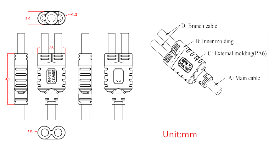 Place of Origin:Guangdong, China Model Number:Y cable connector Type:Adapter Application:Power Gender:T connector Color:Black Pin:2pin Cable OD:7.5-10mm Waterproof level:IP67 Current rating:20A Voltage rating:250V Operating rating:-40℃-+105℃ Material:PA66 Connector type:Screw with cable